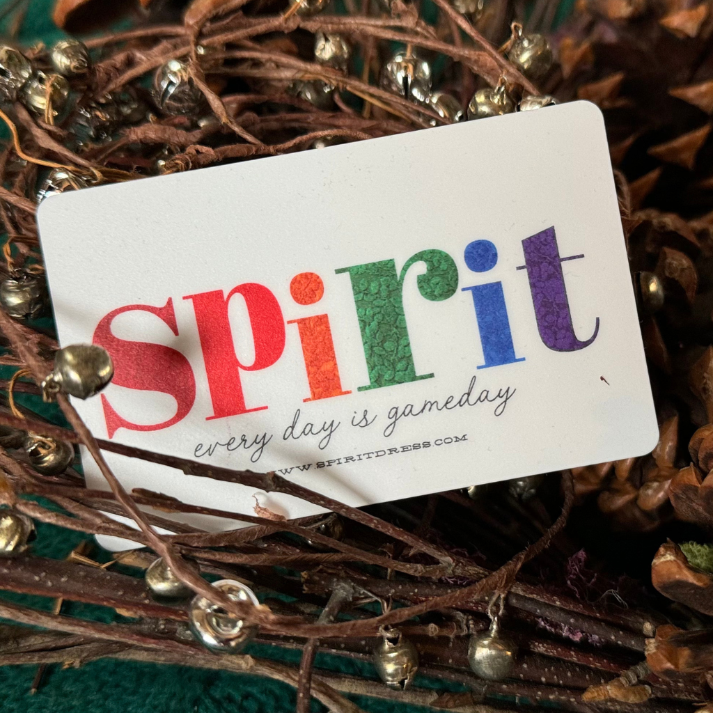 Spirit Dress Gift Cards are physical gift cards that will be mailed to you. If you prefer a digital gift card, drop Mercer a line and she'll invoice you for it separately so you do not incur a shipping charge.