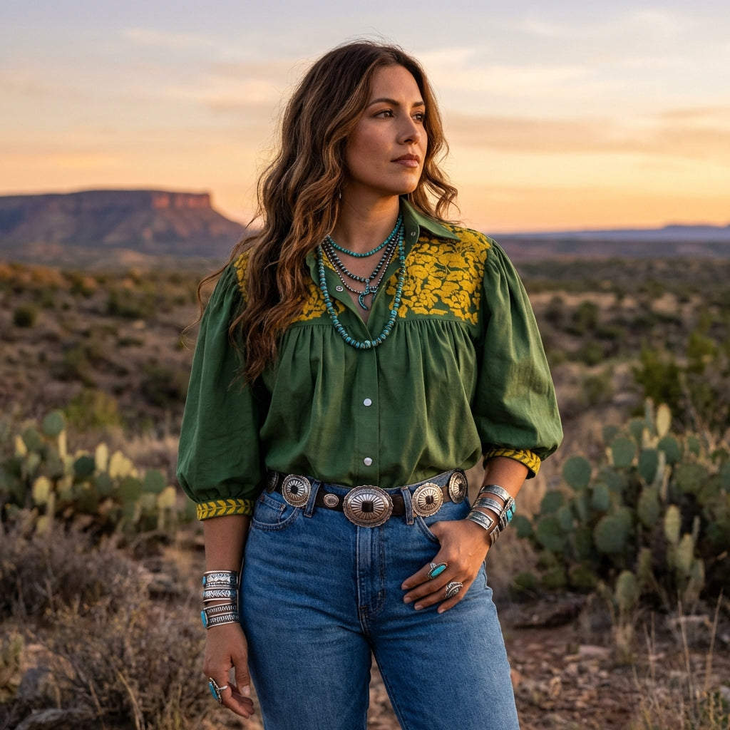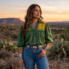 Get ready to shine in the Baylor Green & Gold Linen Cowgirl Blouse! Crafted from a breezy cotton-linen mix in vibrant green, it features eye-catching gold embroidery and classic pearl snaps. Whether you pop the collar, button it up, or layer it over a tank, this blouse keeps your look fresh and fun all season long. Perfect for showing off your Baylor Bear spirit with style!