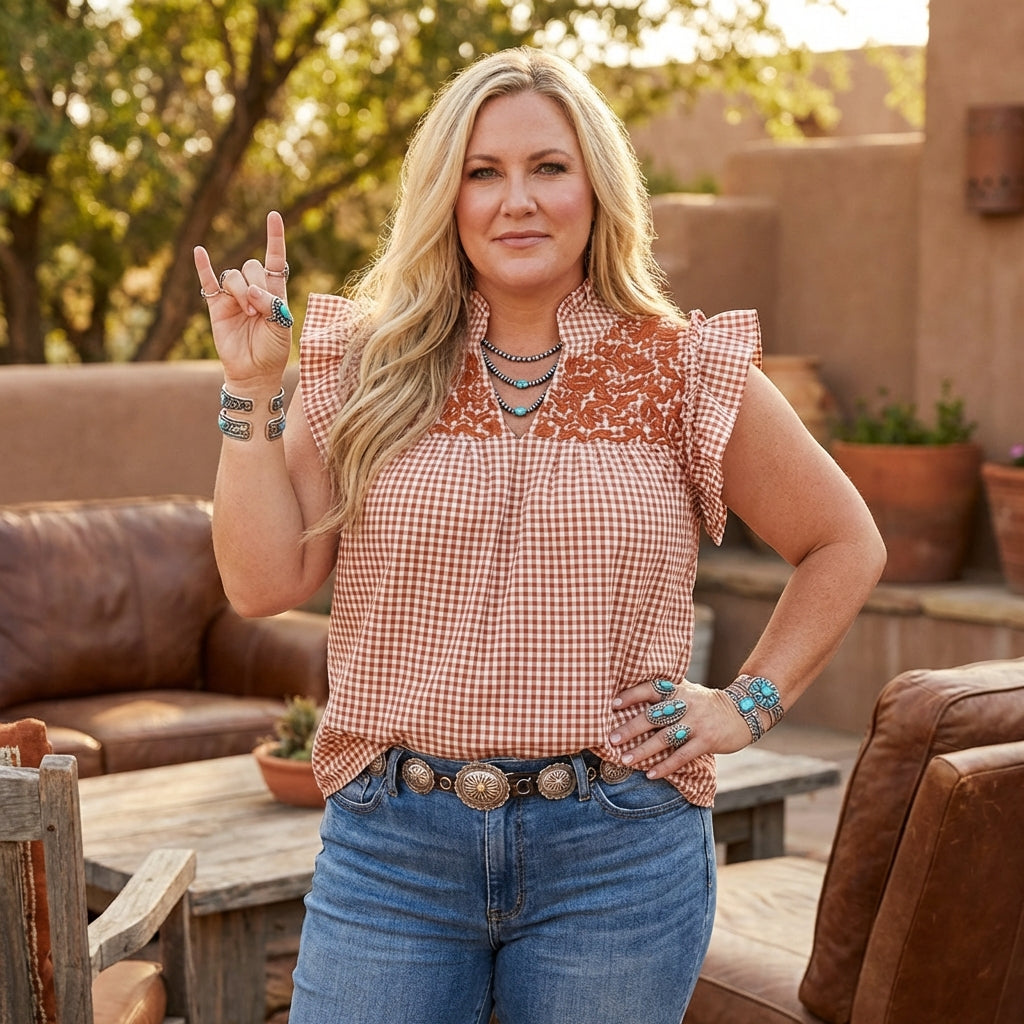 Get ready to flutter into game day season with our whimsical burnt orange gingham Hummingbird Blouse! Featuring a triple ruffle sleeve and high ruffle collar, this versatile top can be dressed up or down for any occasion. Tuck it in or wear it like a tunic!