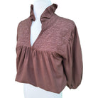 Meet our Double Chocolate Linen Tailgater Blouse — crafted from a breezy cotton-linen blend in chocolate brown, adorned with delicate matching embroidery. This ruffled collar and flirty v-neck is a wardrobe essential. With its easygoing style and perfect lightweight linen, it’s a fall favorite in southern weather!