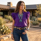 Be the ultimate fan in our Double Purple Hummingbird Blouse! Perfect for graduation gifting for future Horned Frogs, Tigers, and more, this charming blouse features a playful hummingbird design, triple ruffle sleeves, and a high collar with v-neck.