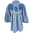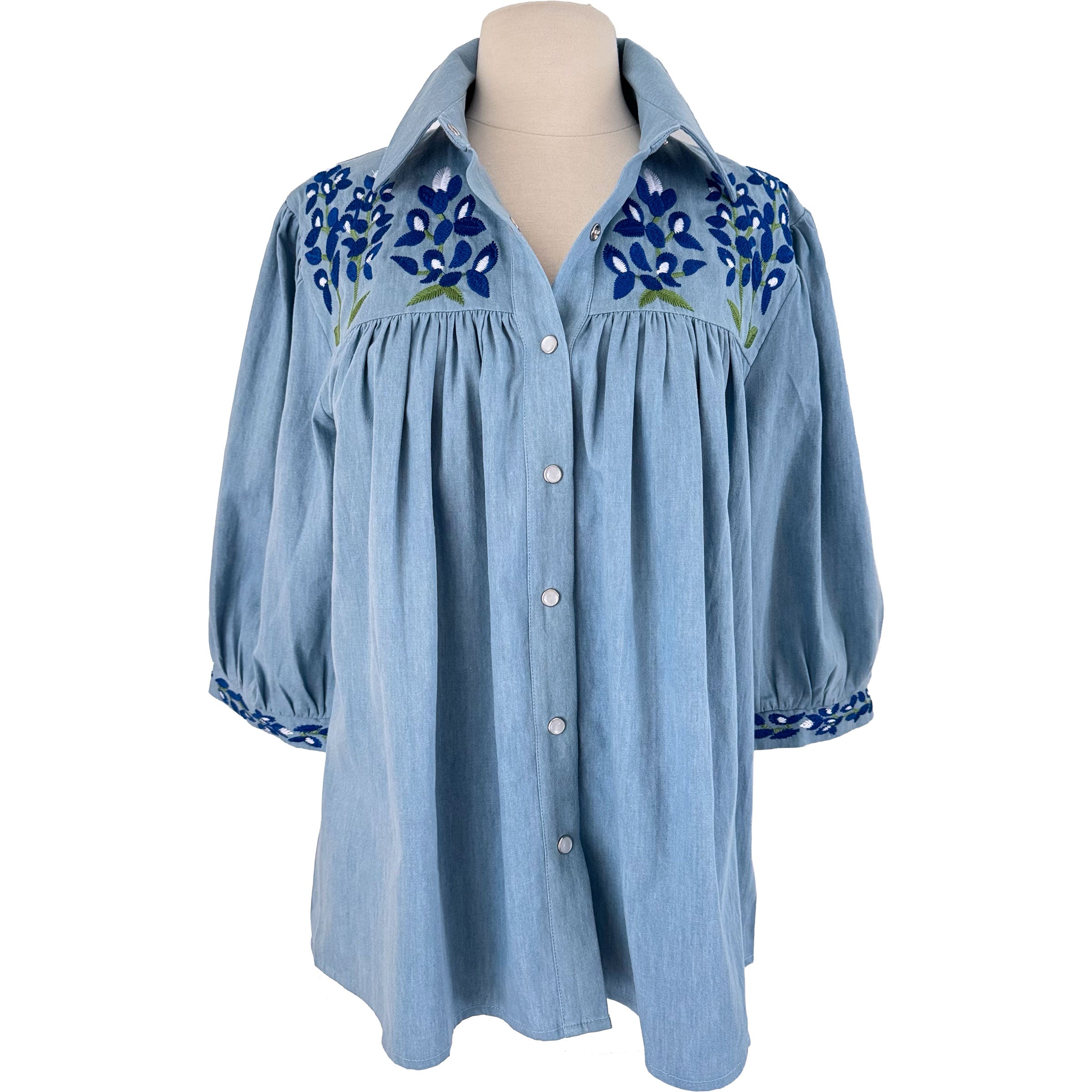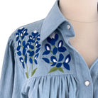 The embroidery pattern that EVERYONE in Texas can agree on: Bluebonnets. These annual blouses are scheduled to start shipping in early February, and feature a comfy, light faded denim fabric with vibrant tricolor bluebonnet embroidery on the front, back, and cuffs. The Cowgirl style has 3/4 puff sleeves, a traditional Oxford collar, that can be worn up or down. *Belt not included.