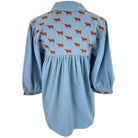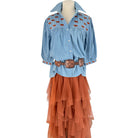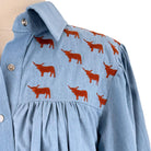 This faded denim blouse with burnt orange steer embroidery takes everything you love about the Spirit Dress tailgater blouse and adds PEARL SNAPS. You'll get the same great lose fit that you've come to expect from Spirit Dress with the versatility of a button-up. Instead of the high ruffle collar, I opted for a traditional collar that can be worn up or down. It's got just enough stiffness to hold its shape whatever you choose. Saddle up and get yours today before they sell out! *Belt and skirt not included