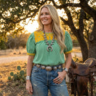 Get ready to cheer in style with our playful Baylor Gingham Halftime Blouse! Featuring gold embroidery on green gingham with puff sleeves, and a charming crew collar add fun flair, while handy pockets keep your essentials close. Perfect for showing off your Baylor Bear spirit, this versatile blouse easily dresses up or down for game day and beyond.