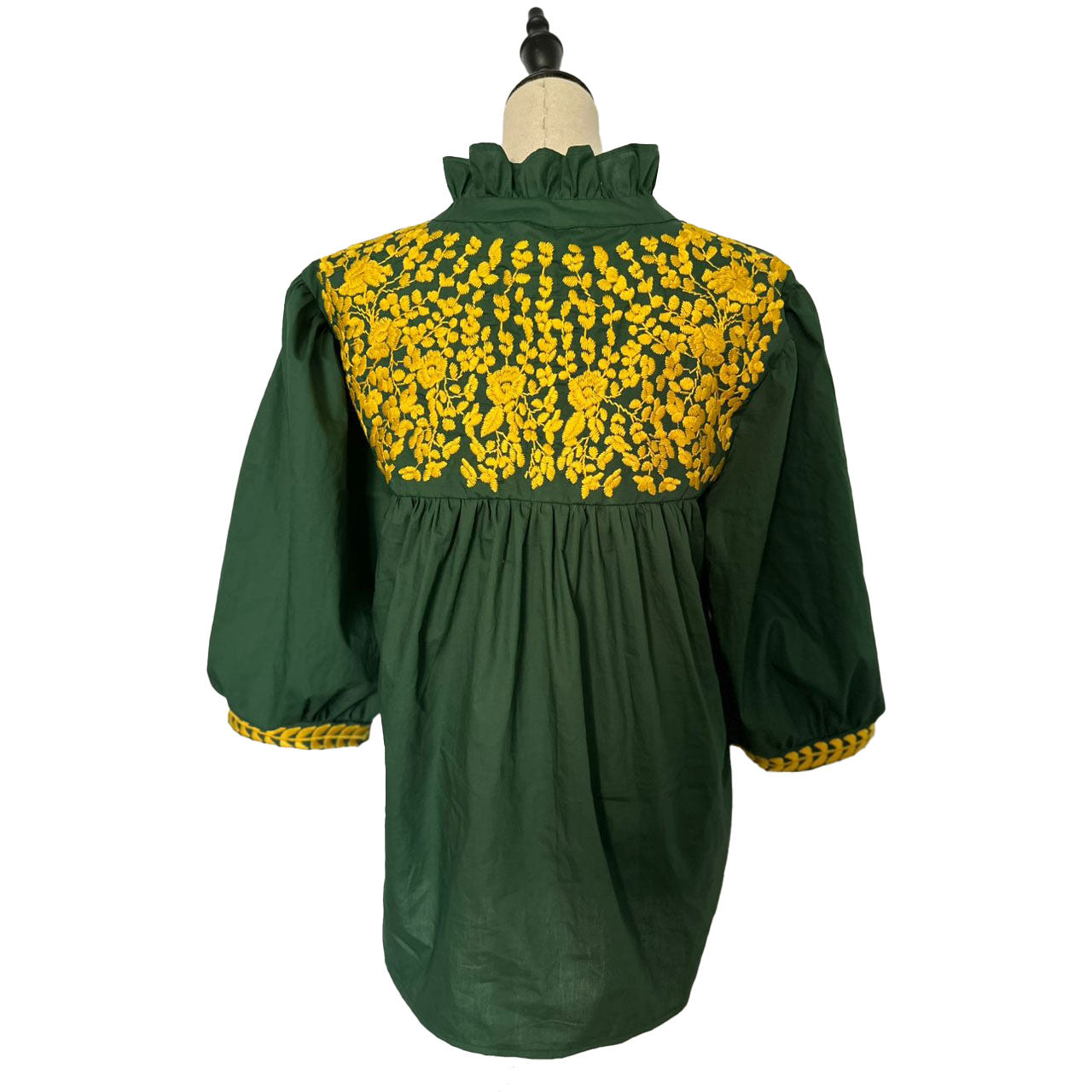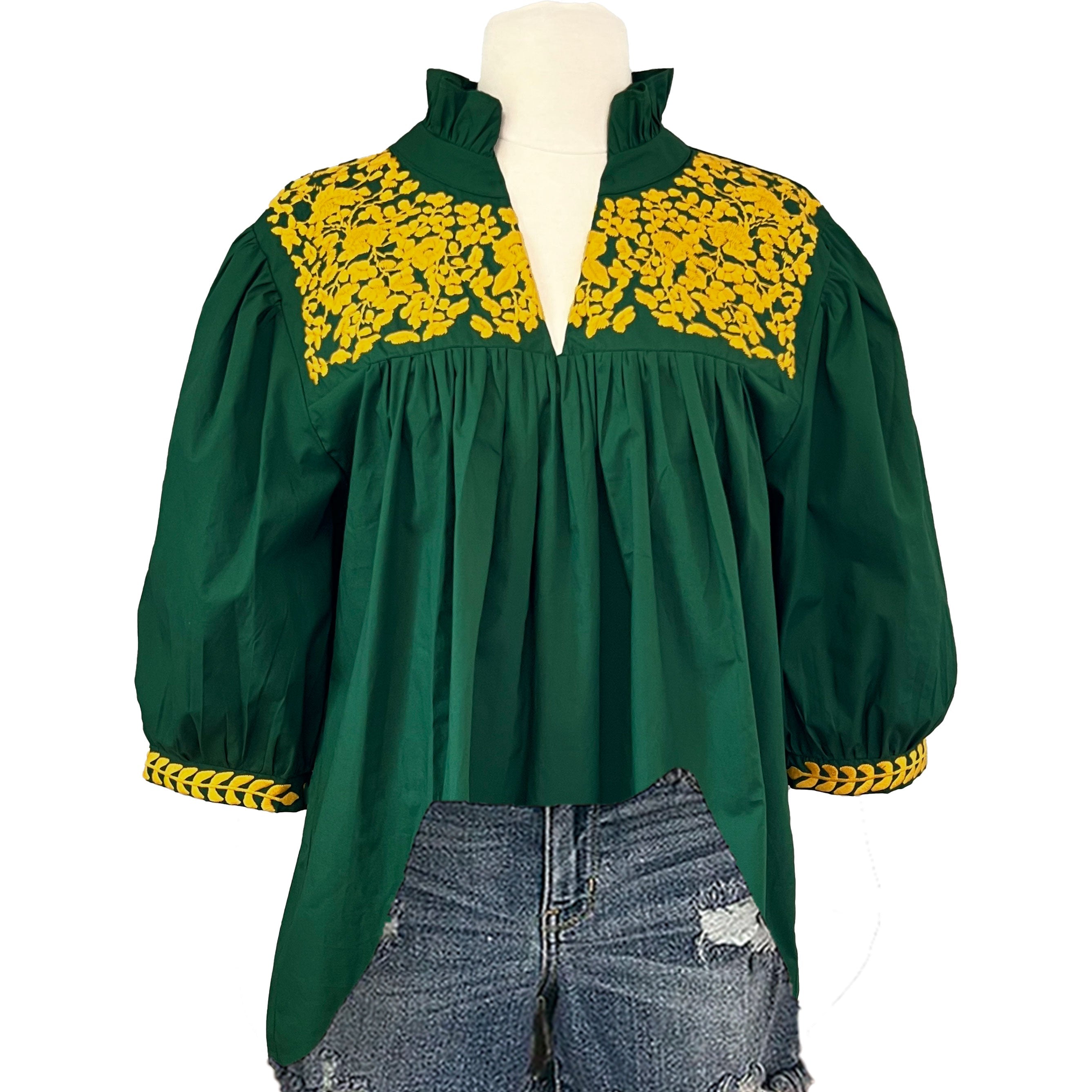 This might actually be the most perfect blouse for tailgating ever made! Introducing THE TAILGATER with gorgeous embroidery front and back (and on the cuffs!), an oversized ruffled collar stands tall for maximum drama, puffy sleeves that provide breathability, and a deep (but not too deep) V-neck that ensures plenty of ventilation. Plus, the tunic cut is fully flexible—you can tuck it in, leave it semi-tucked, or go full-on untucked. You've never been so comfortable sitting on the back of a tailgate. Trust me on this one.