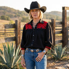 Get ready to shine in the Black + Red Linen Cowgirl Blouse! Crafted from a breezy cotton-linen mix in vibrant black, it features eye-catching red embroidery and classic pearl snaps. Whether you pop the collar, button it up, or layer it over a tank, this blouse keeps your look fresh and fun all season long. Perfect for showing off your team spirit with style! Great for Texas Tech and Georgia fans!