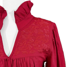 Step into holiday cheer with our 2025 Cranberry Red Holiday Tailgater Blouse! This bright cranberry red has matching embroidery. In our beloved Tailgater cut, it features a ruffled collar and a flirty v-neck. Perfect for bringing a playful twist to your holiday wardrobe, this blouse is ready to ship pre-Thanksgiving—grab yours now and sleigh the season in style!