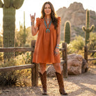 Get ready to flutter into game day season with our whimsical double burnt orange Hummingbird Dress! Featuring a triple ruffle sleeve and high ruffle collar, this on-trend dress will look great with your favorite boots!
