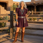 Get ready to flutter into game day season with our whimsical double maroon Hummingbird Dress! Featuring a triple ruffle sleeve and high ruffle collar, this on-trend dress will look great with your favorite boots!