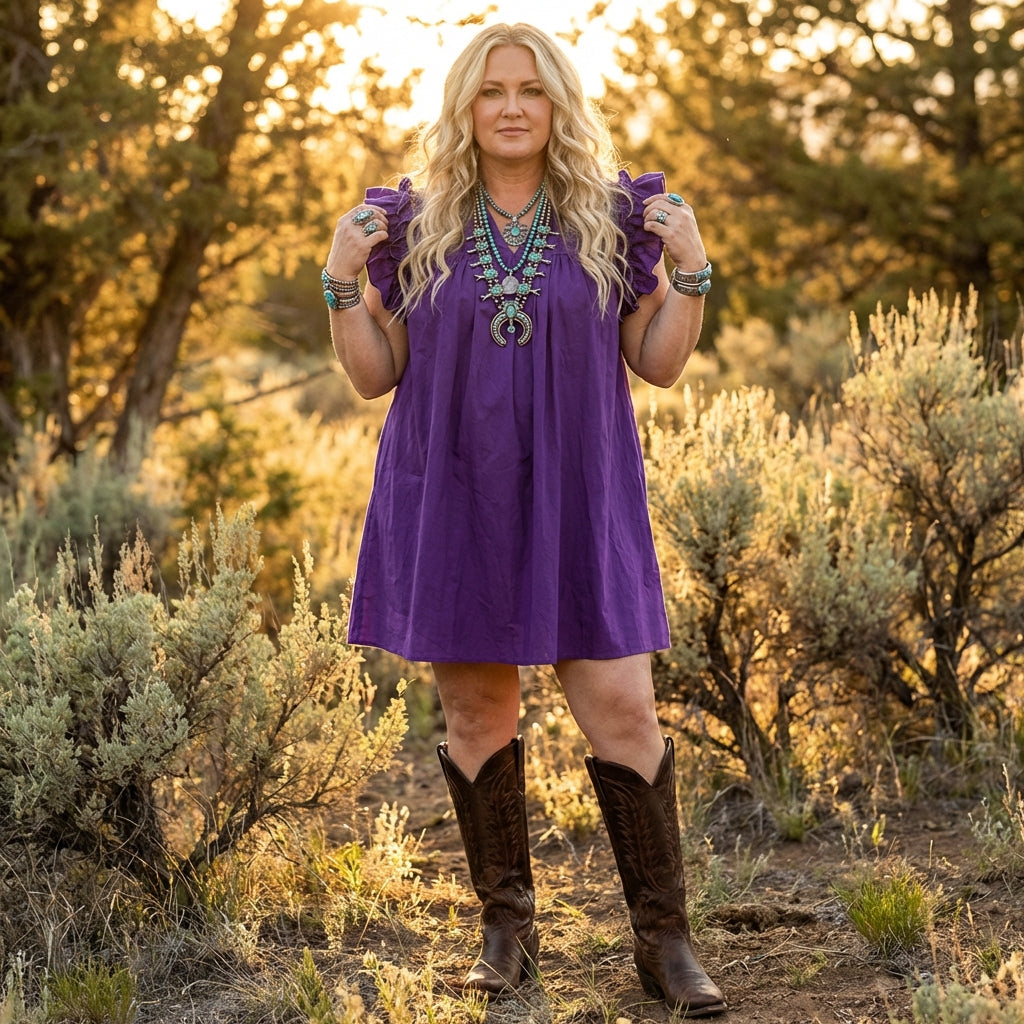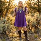 Get ready to flutter into game day season with our whimsical double purple Hummingbird Dress! Featuring a triple ruffle sleeve and high ruffle collar, this on-trend dress will look great with your favorite boots!