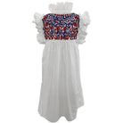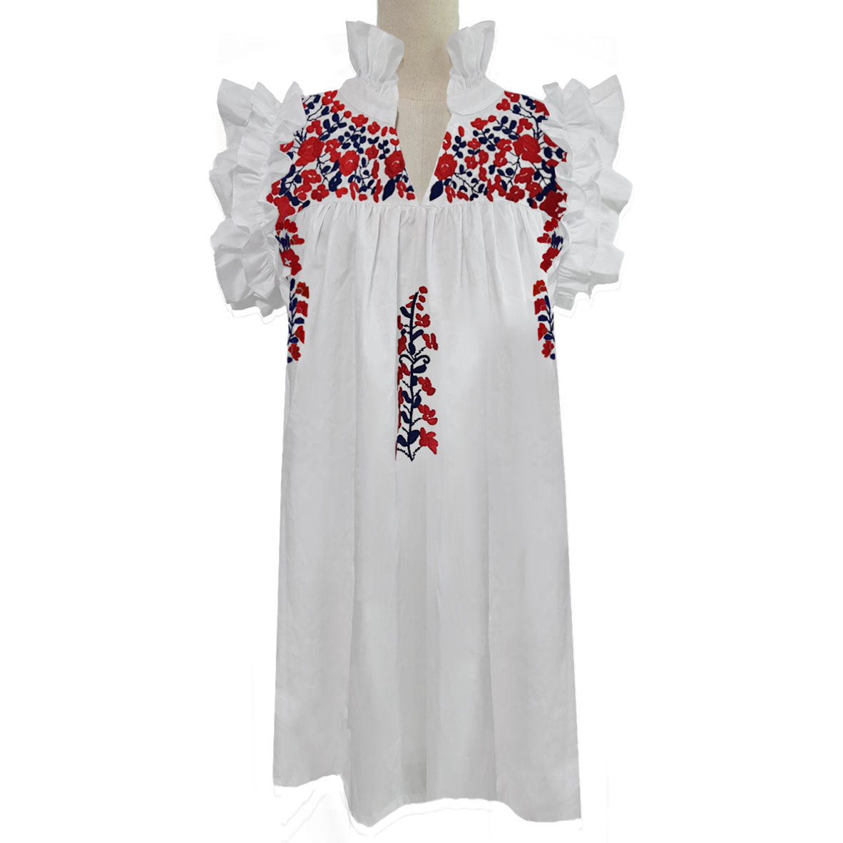 Crisp white cotton dress featuring a high ruffle collar, v-neck collar, triple ruffled short sleeves, and POCKETS. With even more embroidery than our traditional Hummingbird, this blouse is perfect for showing off your patriotic spirit in red, white, and blue.