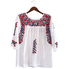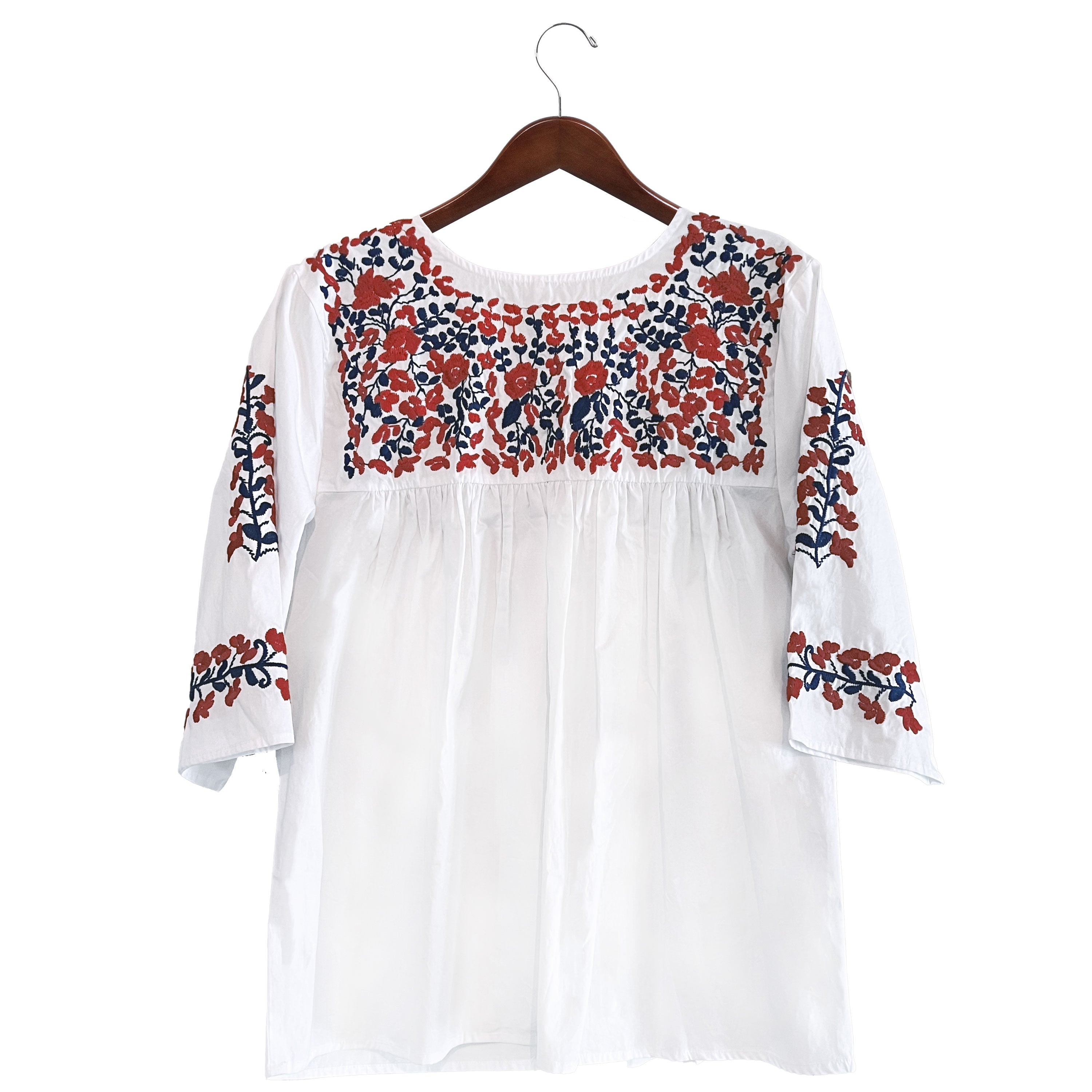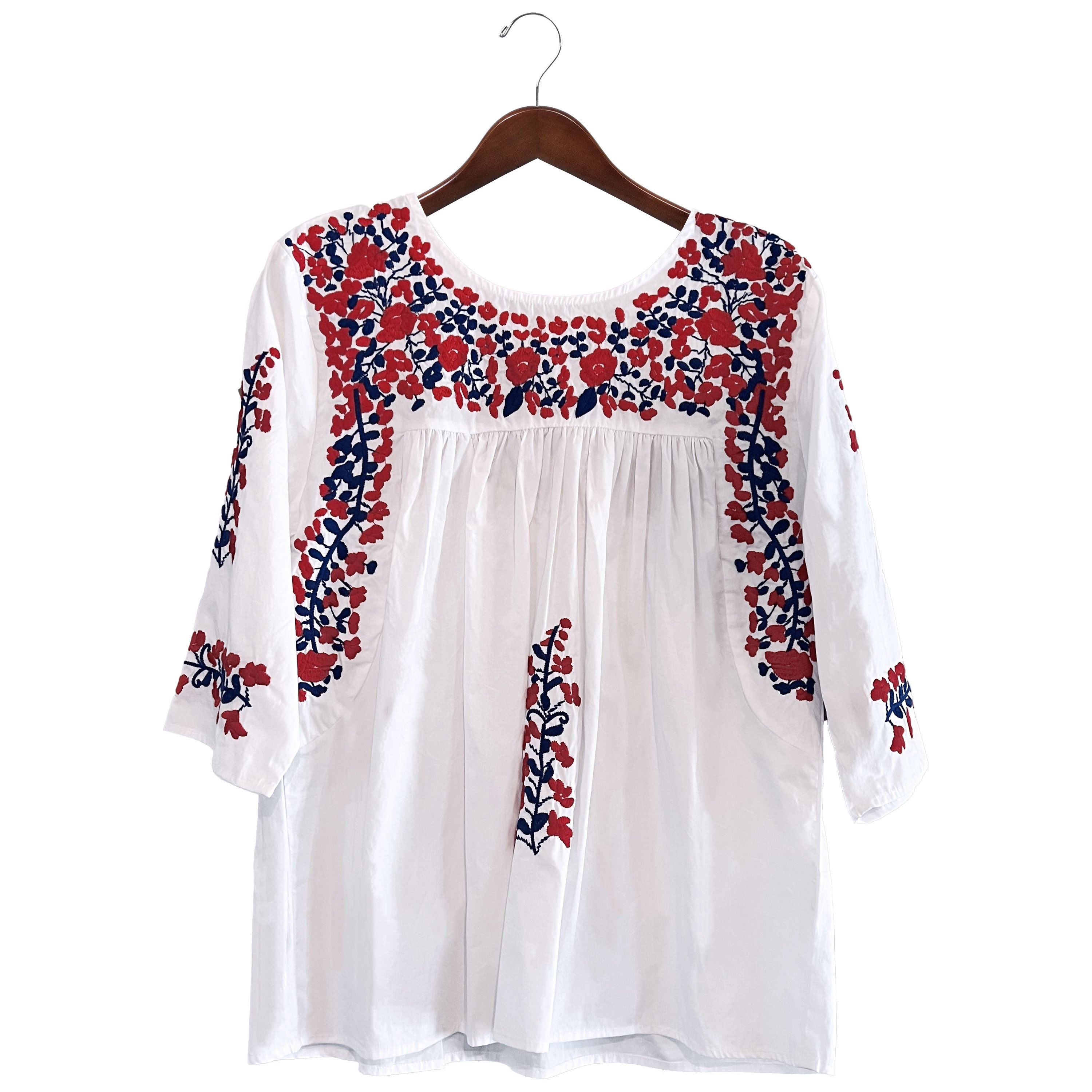 Ccrisp white cotton blouse in our ever-popular Saturday style - featuring a crew collar and three-quarter sleeves. This blouse is perfect for showing off your patriotic spirit in red, white, and blue.