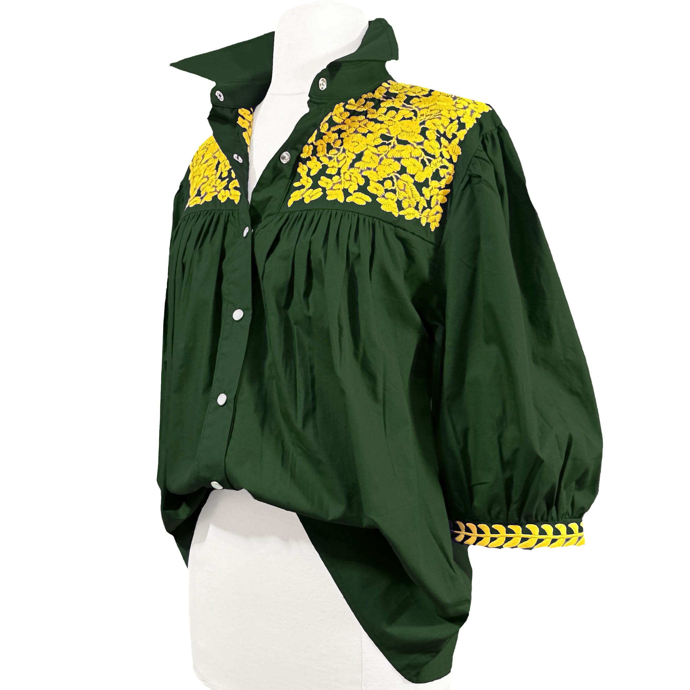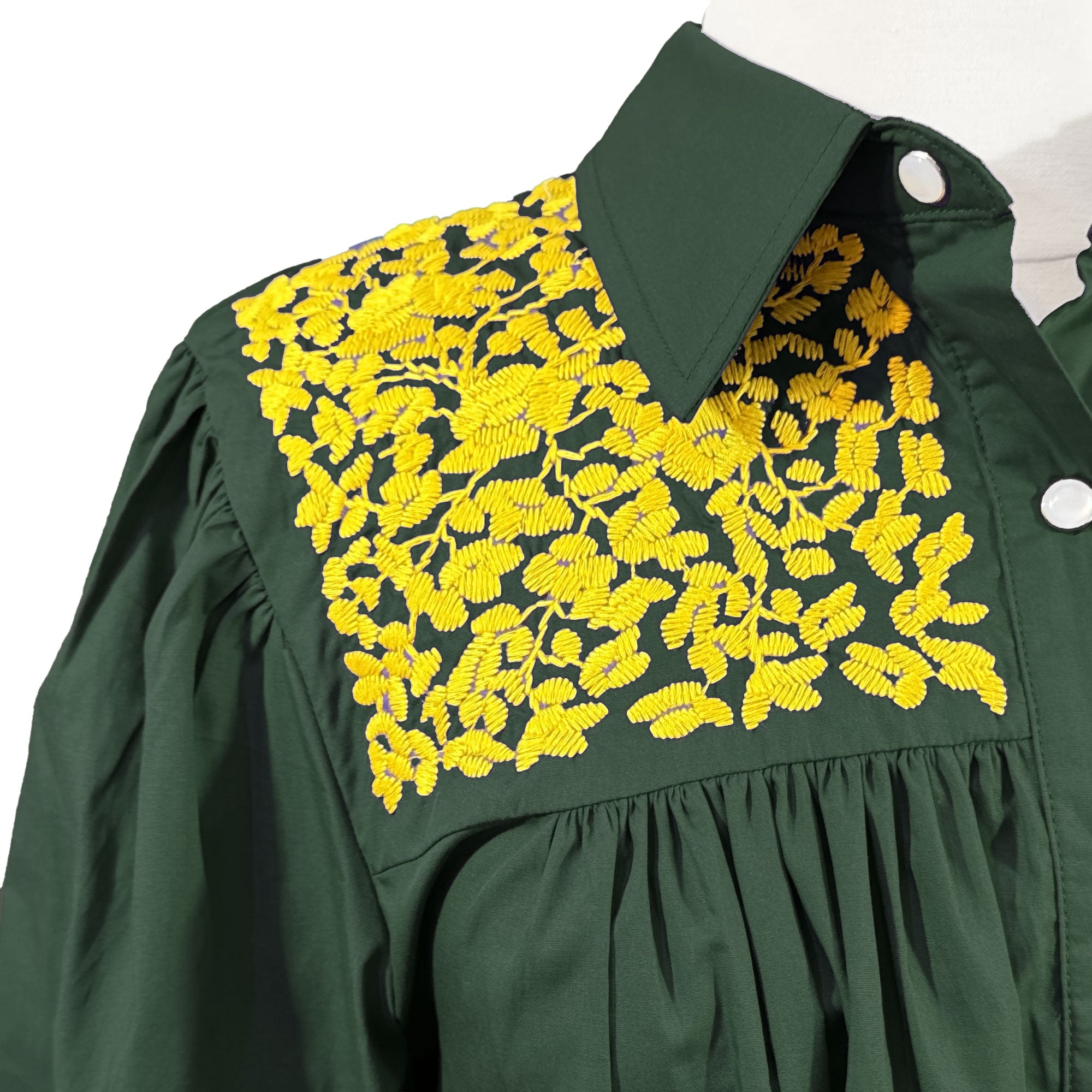 Giddyup, cowgirl. This green blouse with gold embroidery takes everything you love about the Spirit Dress tailgater blouse and adds PEARL SNAPS. You'll get the same great loose fit that you've come to expect from Spirit Dress with the versatility of a button-up. Instead of the high ruffle collar, I opted for a traditional collar that can be worn up or down. It's got just enough stiffness to hold its shape whatever you choose. Saddle up and get yours today before they sell out!
