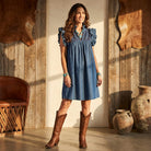Get the best of both worlds with our Indigo Denim Hummingbird Dress! Made from indigo denim fabric that is halfway between jeans and chambray, this dress is the perfect weight for any season. It features a ruffled collar, triple ruffle sleeves, and a flirty v-neck, along with matching embroidery for an added touch of detail. Oh and it has pockets!