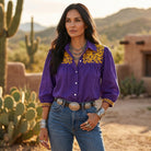 Get ready to shine in the LSU Purple & Gold Linen Cowgirl Blouse! Crafted from a breezy cotton-linen mix in vibrant Geaux Tiger purple, it features eye-catching gold embroidery and classic pearl snaps. Whether you pop the collar, button it up, or layer it over a tank, this blouse keeps your look fresh and fun all season long. Perfect for showing off your team spirit with style!