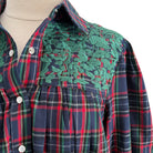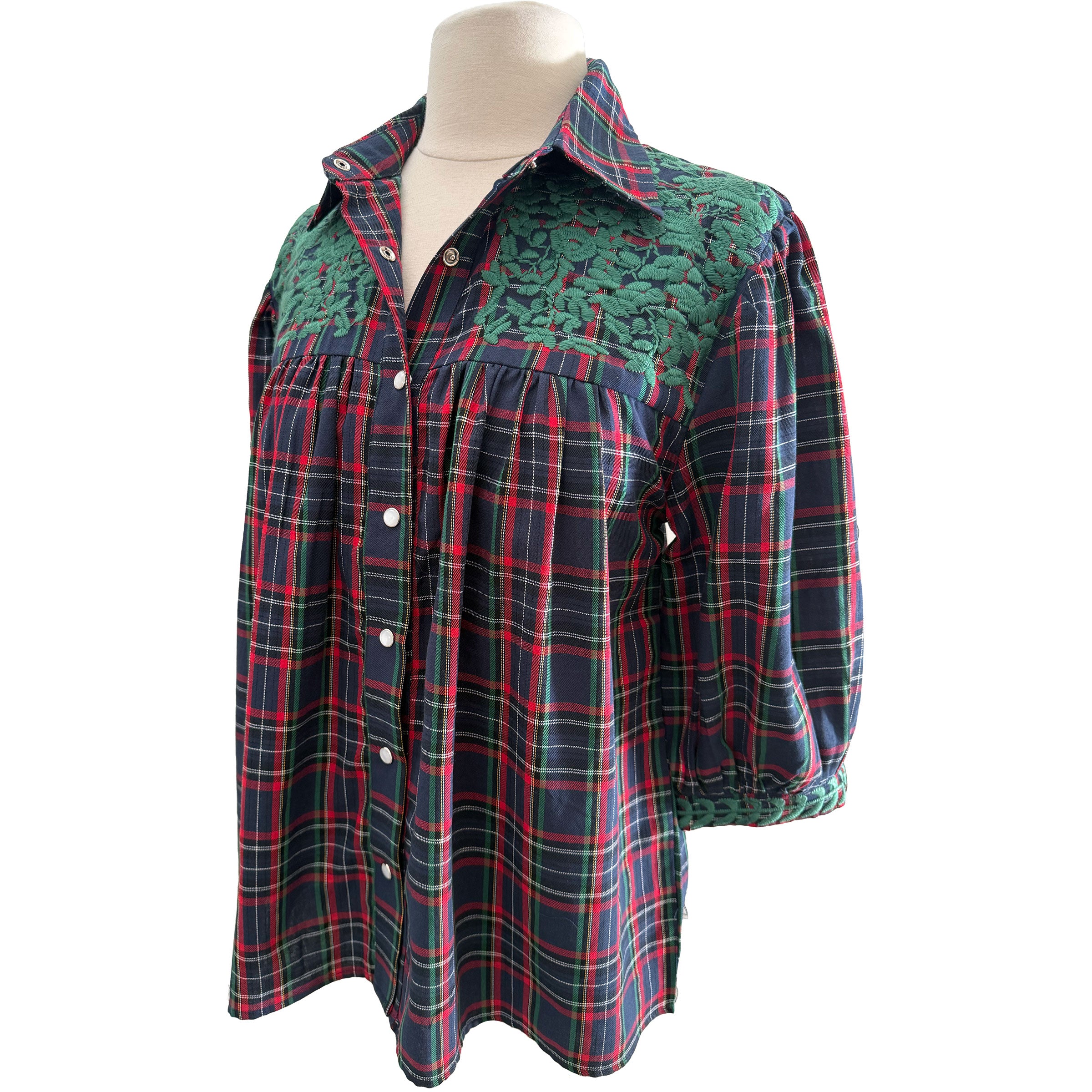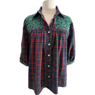 Step into holiday cheer with our 2025 Navy Holiday Tartan Cowgirl Blouse! This cheery navy tartan shines with festive green embroidery and classic pearl snaps. Designed in our favorite Cowgirl cut, it features an adjustable collar you can rock up or down. Perfect for bringing a playful twist to your holiday wardrobe, this blouse is ready to ship pre-Thanksgiving—grab yours now and sleigh the season in style!