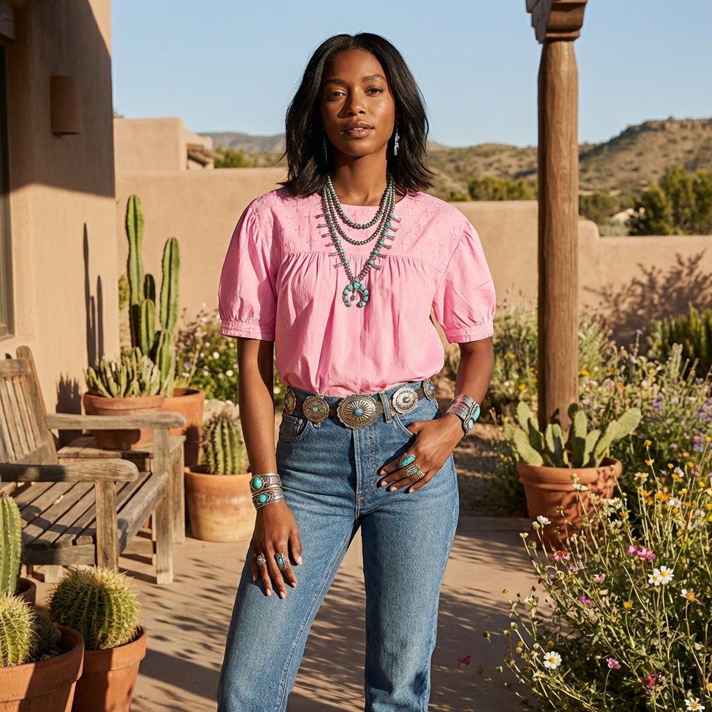 Say hello to spring with this charming pink blouse featuring matching pink cross embroidery and a modest crew collar. The cute puff cap sleeves add a touch of fun to any day, making it the perfect choice for a Sunday outing.