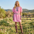 Say hello to spring with this charming pink dress featuring matching pink cross embroidery and a modest crew collar. The cute puff cap sleeves add a touch of fun to any day, making it the perfect choice for a Sunday outing.