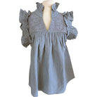Faded denim blouse with matching embroidery. Shoulder ruffles. V-neck with ruffled collar. Sample. Final Sale.