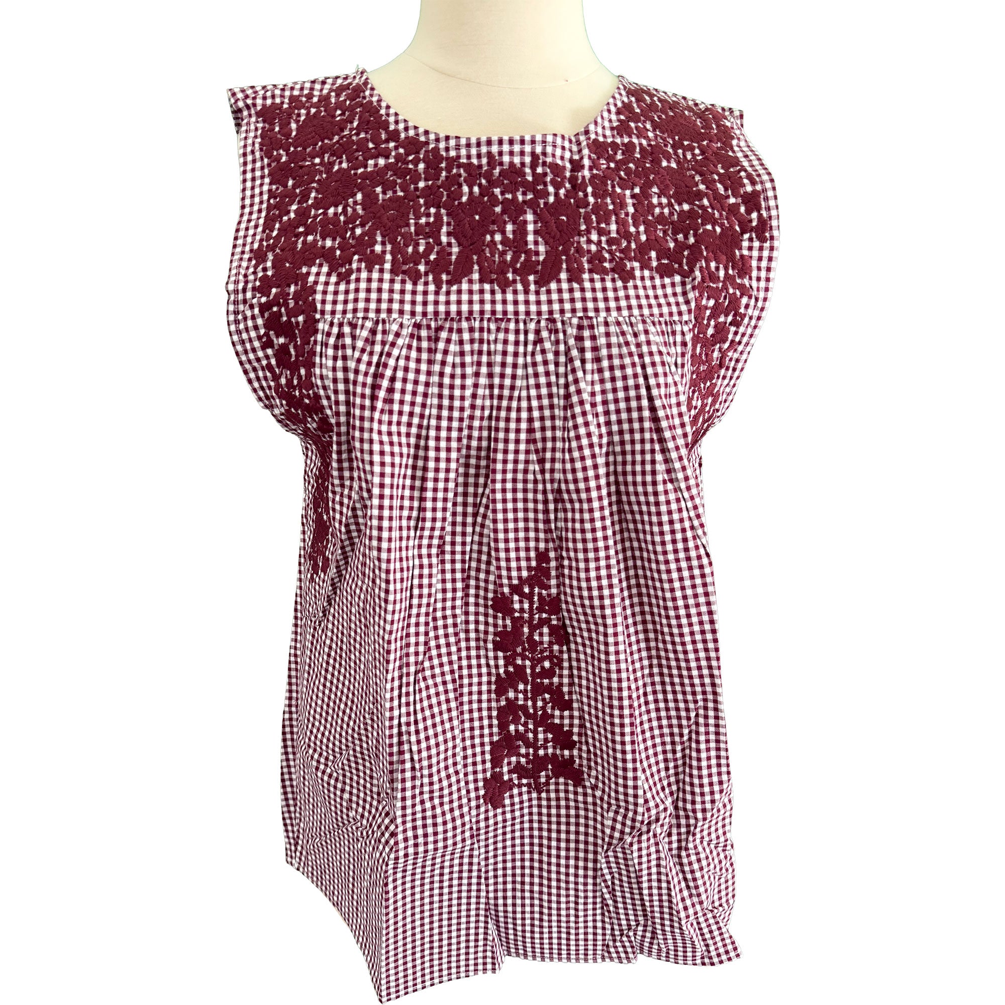 Maroon gingham blouse with maroon embroidery. Sleeveless. Crew collar. Sample. Final Sale.