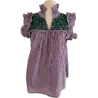 Purple gingham blouse with green embroidery. Shoulder ruffles. V-neck with ruffled collar. Sample. Final Sale.