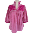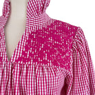 Get ready to turn heads this Valentine's Day in our gingham tailgater blouse. Bursting with a bold raspberry print and delicate embroidery details, this playful top features a charming ruffle collar and flattering v-neckline. The relaxed silhouette and 3/4 sleeves offer all-day comfort, making it ideal for spreading love and laughter wherever you go. A must-have for your seasonal collection.