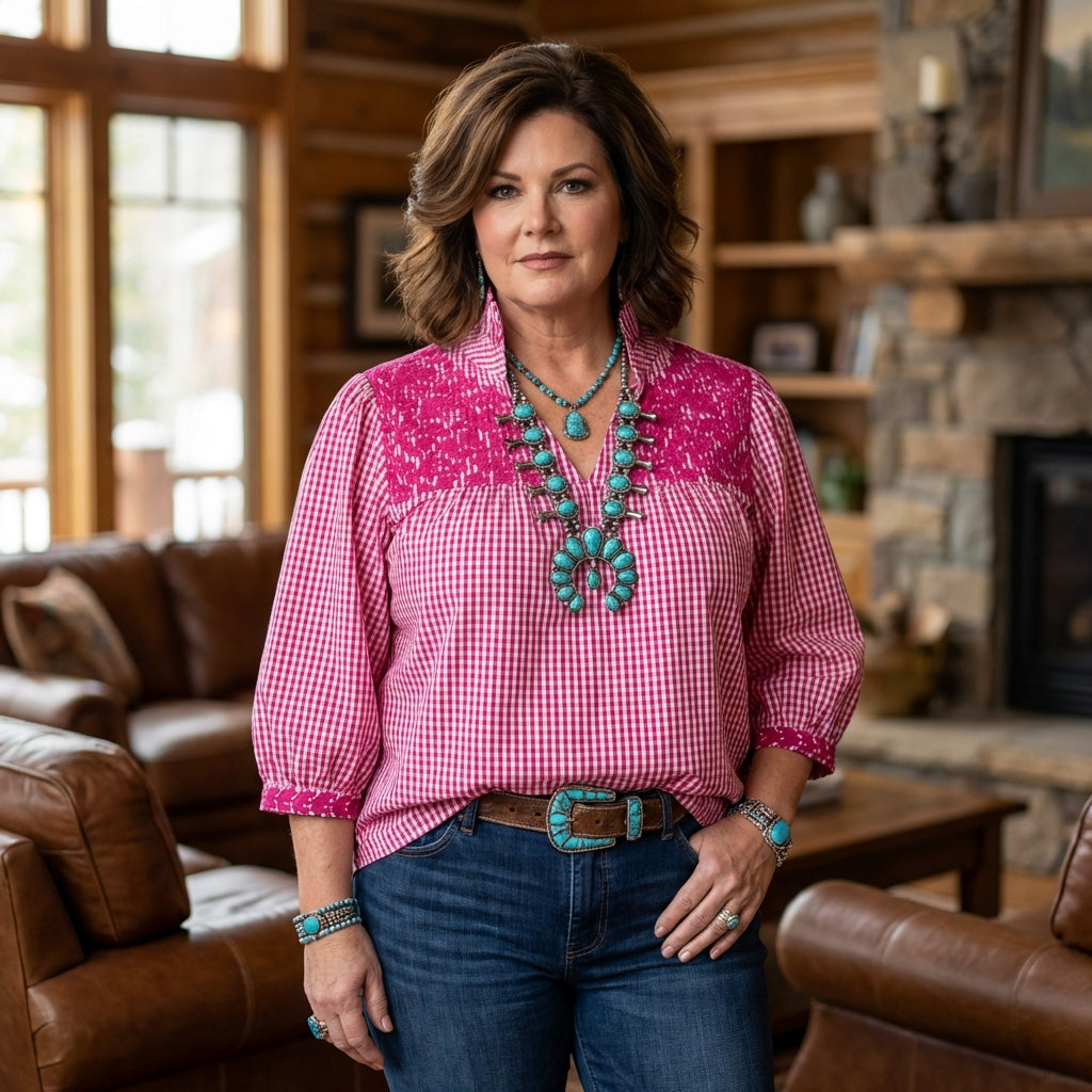 Get ready to turn heads in our hot pink gingham tailgater blouse. Bursting with a bold raspberry print and delicate embroidery details, this playful top features a charming ruffle collar and flattering v-neckline. The relaxed silhouette and 3/4 sleeves offer all-day comfort, making it ideal for spreading love and laughter wherever you go. A must-have for your seasonal collection.